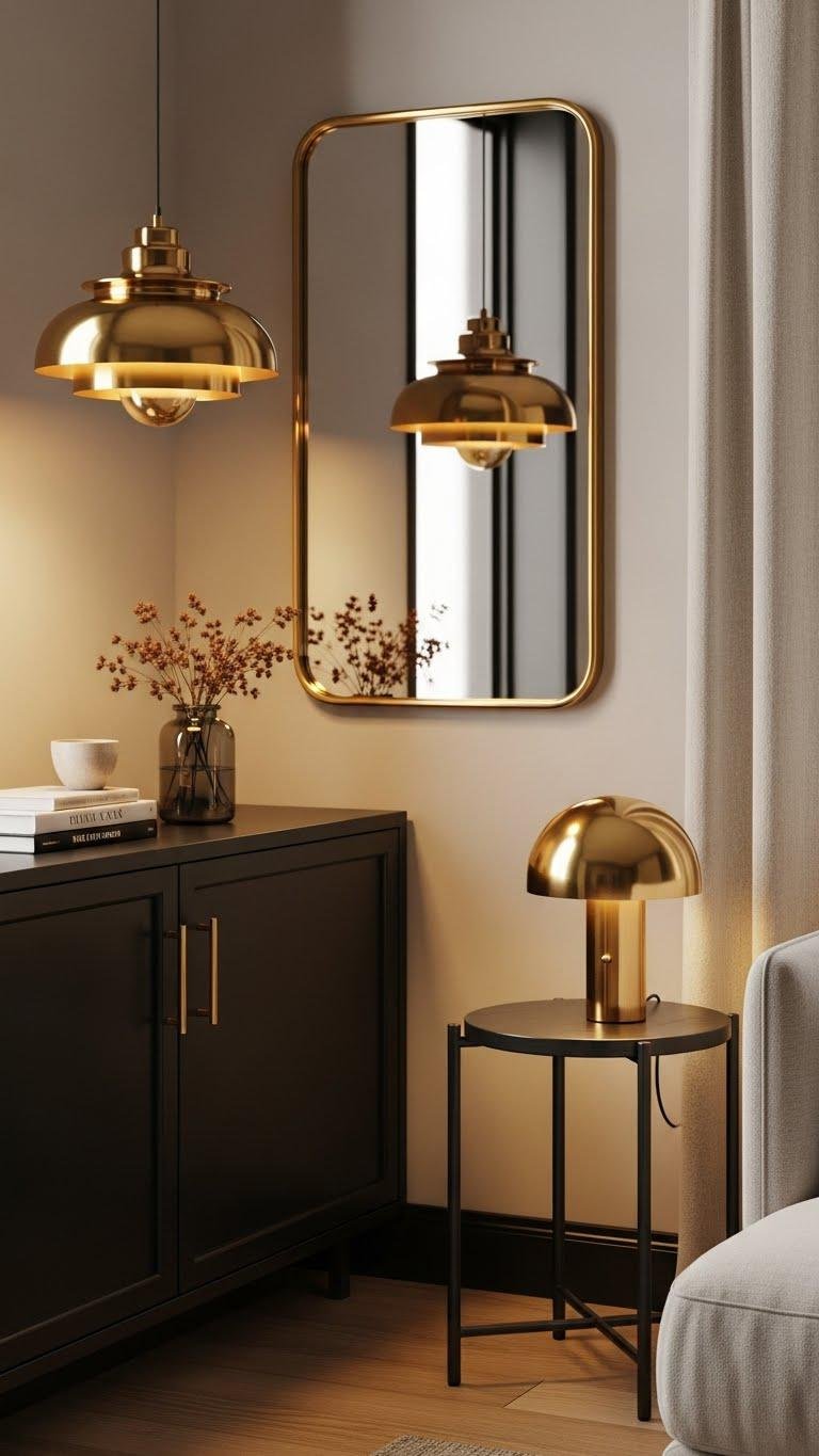 Balance warm metallics with matte black accents to give a cozy room instant polish and modern edge. You’ll layer warm brass fixtures, mirrors, and lighting to reflect soft light, then ground the look with matte black hardware and trim. Mix finishes sparingly so each element breathes; the contrast feels liberated, intentional, and quietly luxurious without overpowering your relaxed, personal space.