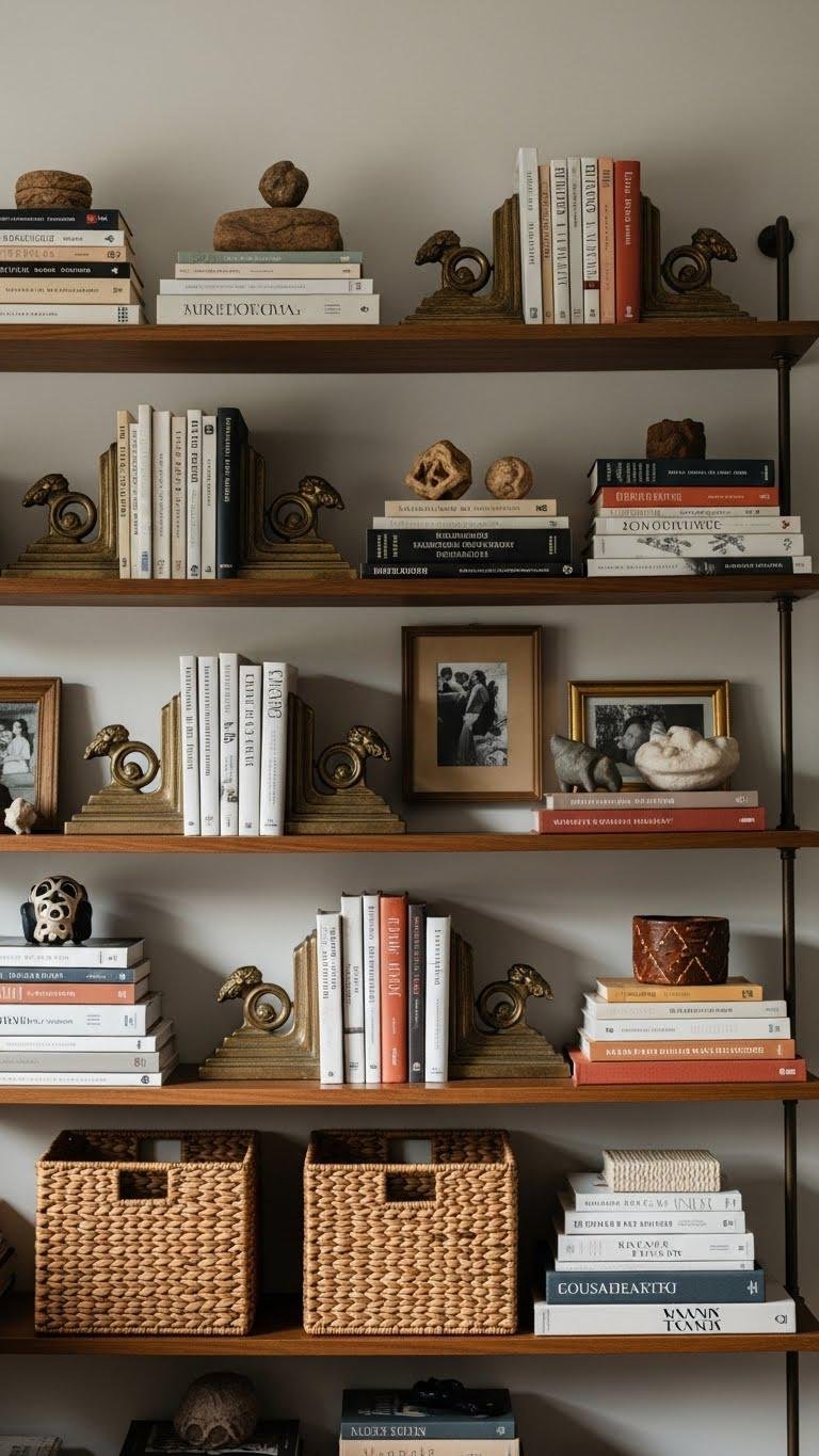 You’ll use antique bookends to anchor titles, place woven storage bins for hidden odds and ends, and rotate objects so the display feels free, lived-in, intentional.