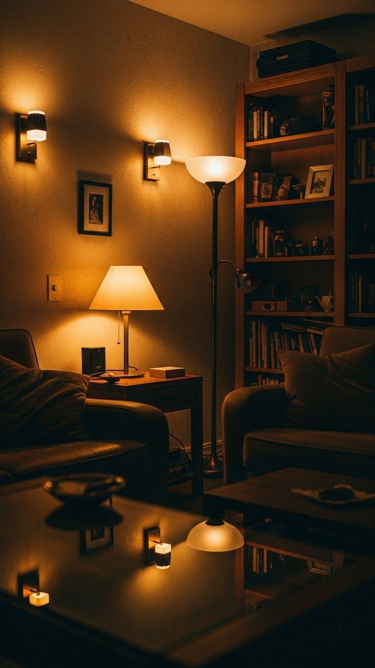 Once your shelves feel lived-in and personal, soften the room’s edges with layered lamps that create a warm, welcoming glow.