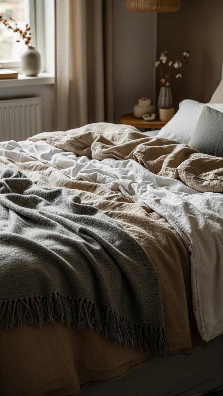 Layering natural fabrics will make your bed feel intentionally soft and breathable while keeping the look refined—start with a linen duvet for its relaxed texture, add a washed-cotton sheet for coolness against the skin, and finish with a wool or cotton throw for insulating warmth.