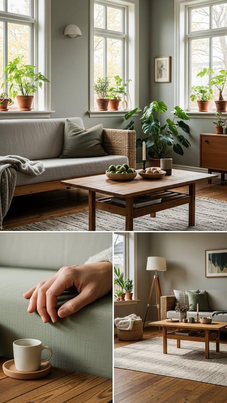 Keep palettes muted, textures tactile, and arrangements uncluttered so you can move freely.
