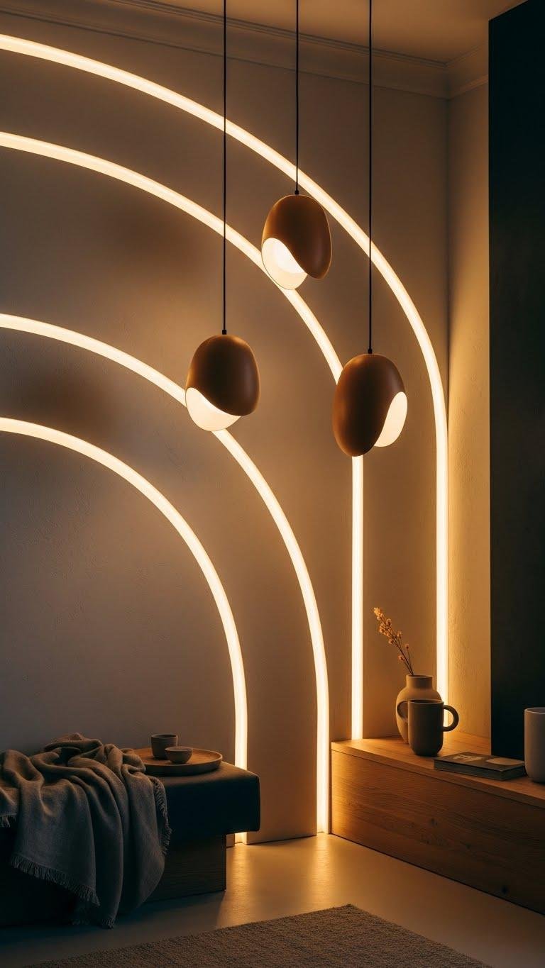 You’ll choose ambient arcs that wash walls and soften corners, pairing them with sculptural pendants to create focal rhythm.