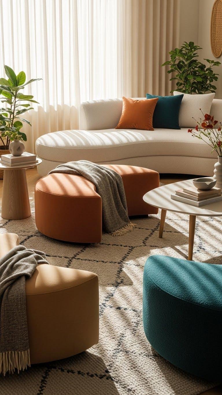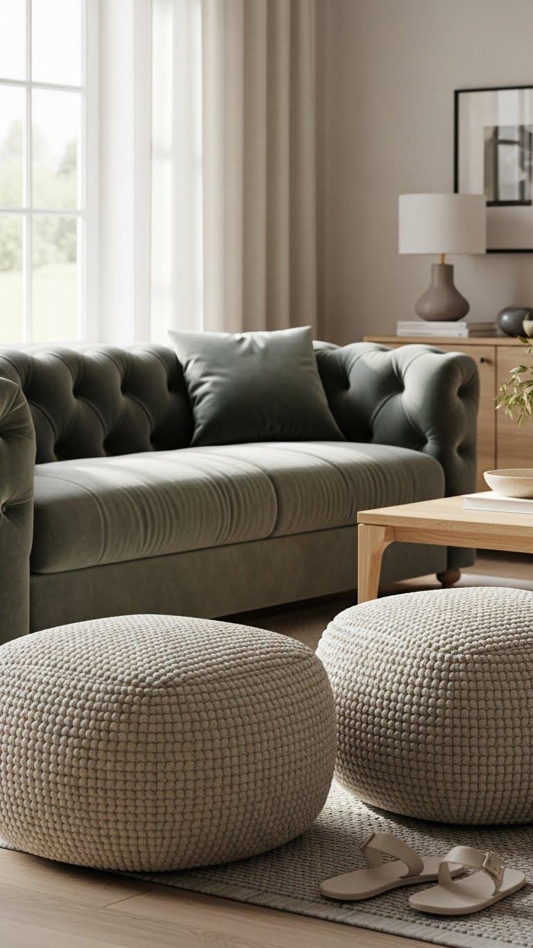 You’ll layer velvet tufting on a sofa for refined depth and add bouclé poufs to invite barefoot lounging.