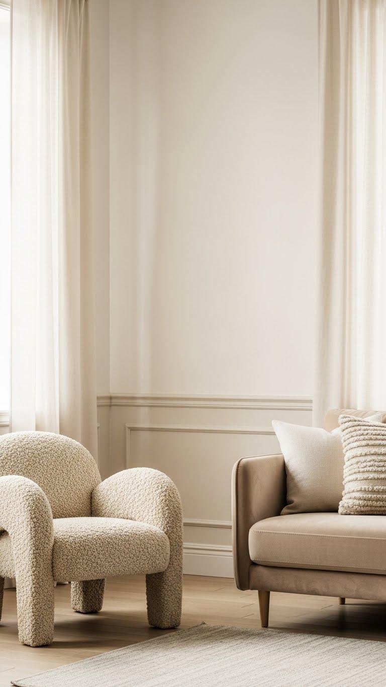 A warm off-white or soft beige will instantly calm a room and make your tactile choices—like velvet and bouclé—pop without competing for attention. Choose paints with subtle cream undertones to add depth and warmth.