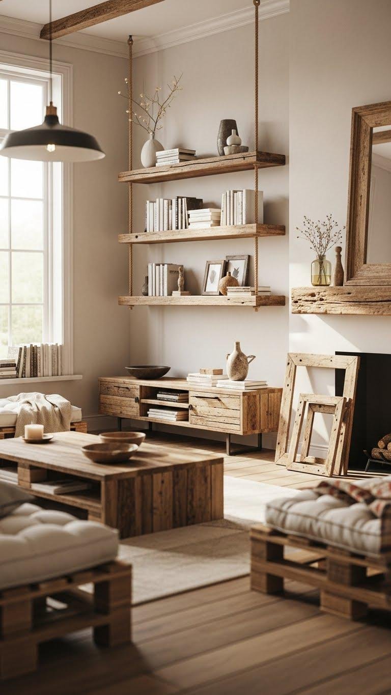 You’ll mix reclaimed wood with upcycled accents—pallet furniture for casual seating and barnwood frames for art—to create a liberated, lived-in vibe.