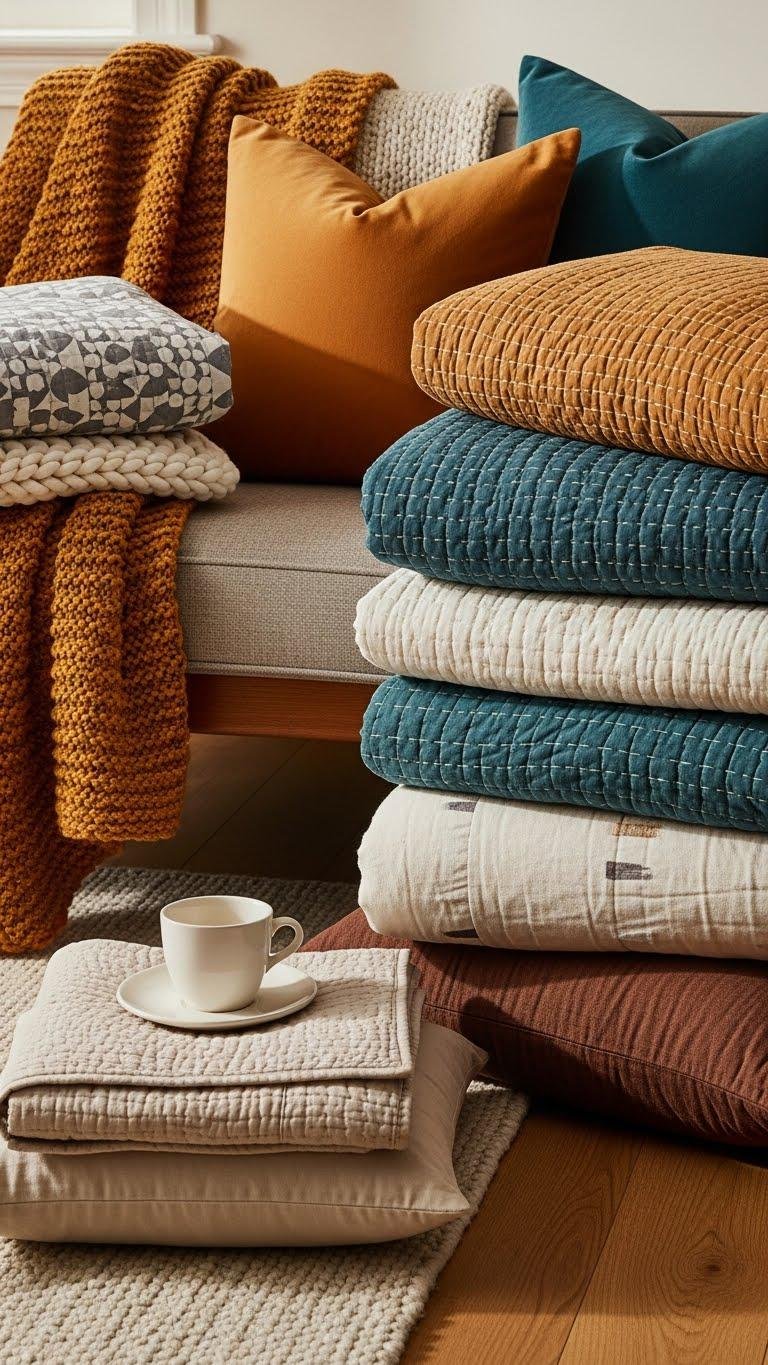 When you layer textiles—throws, quilts, cushions, and rugs—you instantly add depth, texture, and a lived-in warmth that makes a room feel intentionally cozy.