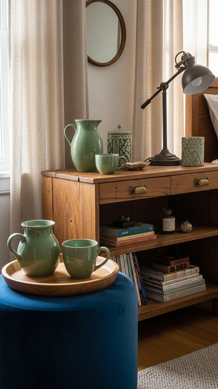 After you’ve layered sage-green ceramics and a sapphire velvet ottoman for that modern-meets-luxe feel, bring in vintage nightstands and collected finds to ground the look with personality and history.