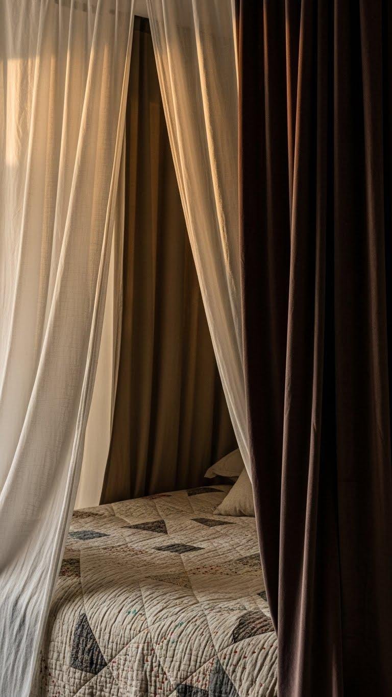 If your handmade quilt anchors a bedside story, canopy curtains will turn that story into a private chapter — soft fabric drapes frame the bed, muffling noise and folding light to create an immediate sense of shelter. You’ll choose draped mosquito netting for airy protection or a romantic bed canopy in linen or velvet, asserting a liberated, intimate retreat that’s both chic and quietly protective.