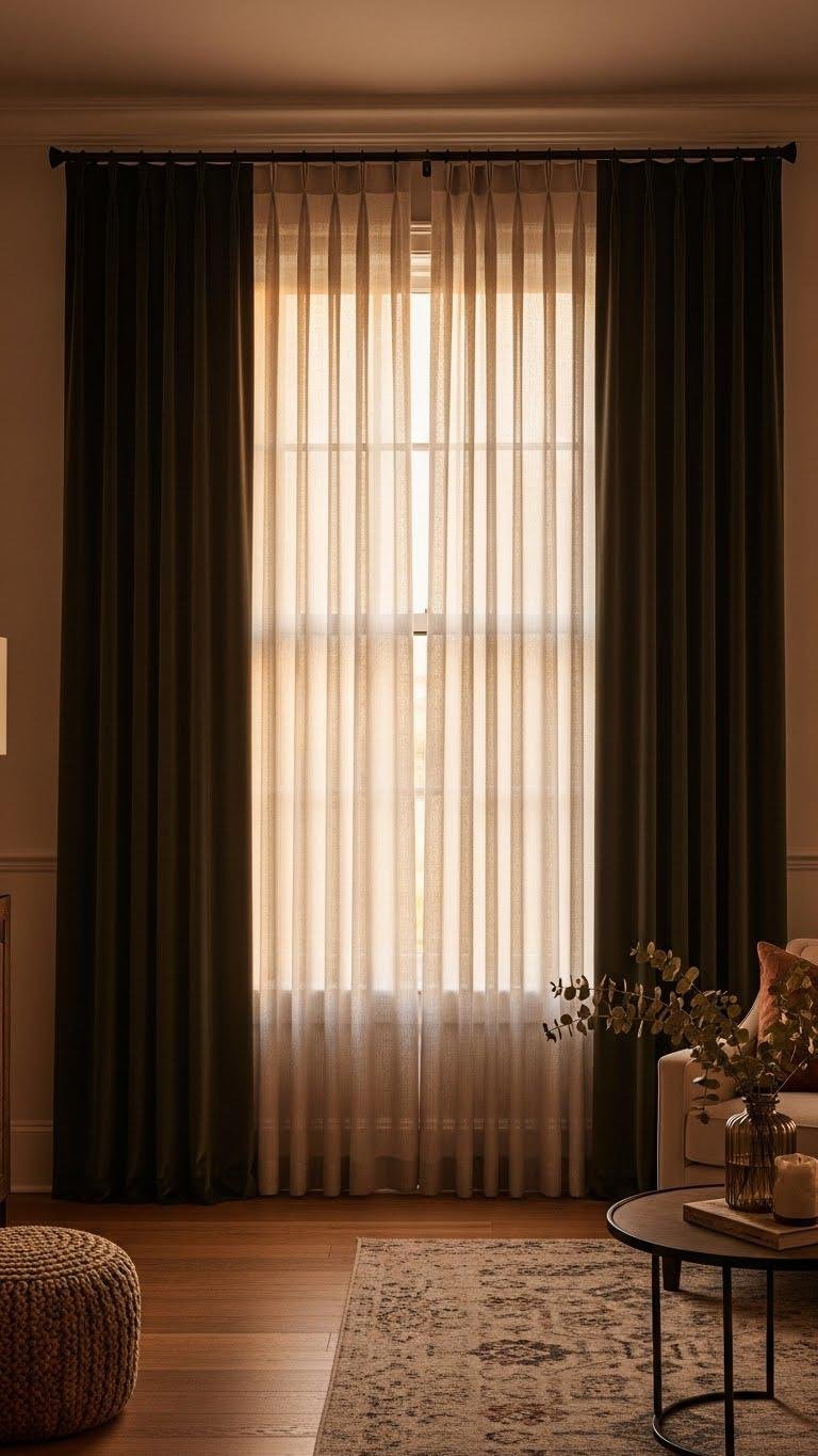 You’ll choose airy linens or velvet with thermal lining to insulate and deepen color. Mount rods near ceilings extension points to exaggerate verticality. Layer sheers and blackout panels for light control and freedom — a chic, enveloping frame that feels like home.