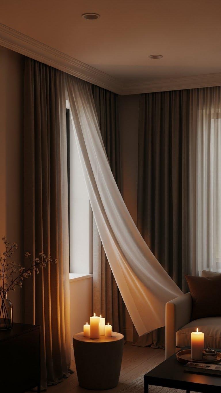 Soft candlelight sets a room’s mood, and crown-molding hidden curtain tracks keep that mood uninterrupted by hardware or harsh lines. You’ll install a recessed rodless system behind a hidden valance so drapes float from ceiling to floor, widening sightlines and freeing the space. This sleek solution feels deliberate and liberating, letting fabric movement soften corners without visual clutter.