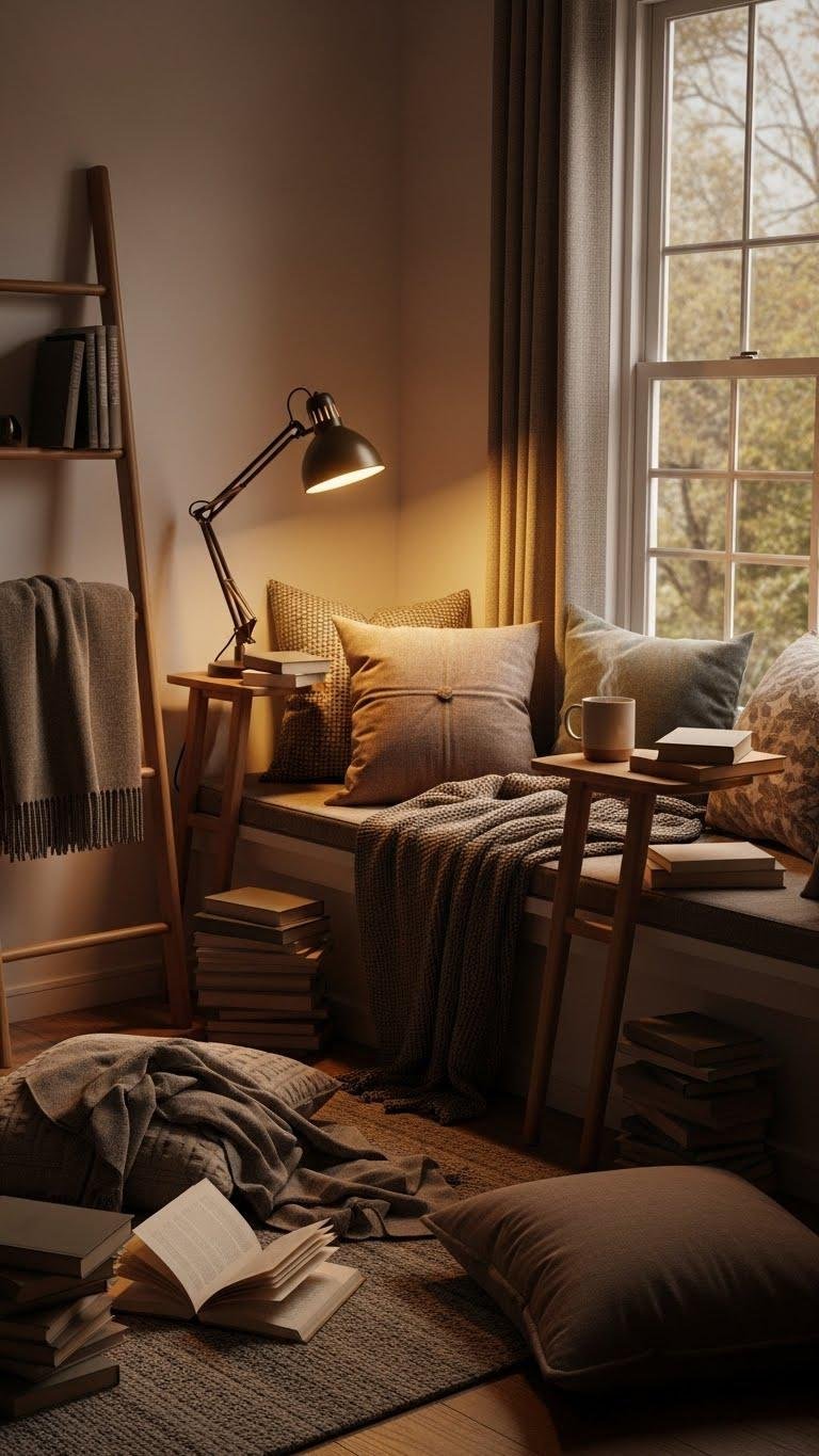 Curl up in a nook that feels intentionally layered and endlessly inviting, where tactile fabrics and measured lighting work together to cradle you through chapters and quiet moments. You’ll craft liberated retreats in window alcoves with plush throws, textured cushions, and a slim side table. Add stacked books, a compact book ladder, and warm task lighting so solitude becomes deliberate, stylish, and utterly restorative.