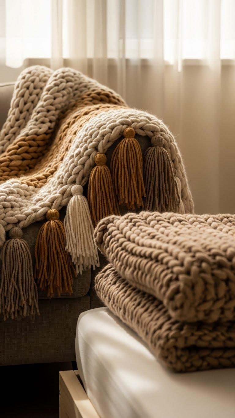 Drape a chunky knit blanket over the arm of your sofa or the foot of your daybed to instantly soften the room and invite you in; the oversized stitches add sculptural texture that reads luxe without trying too hard.