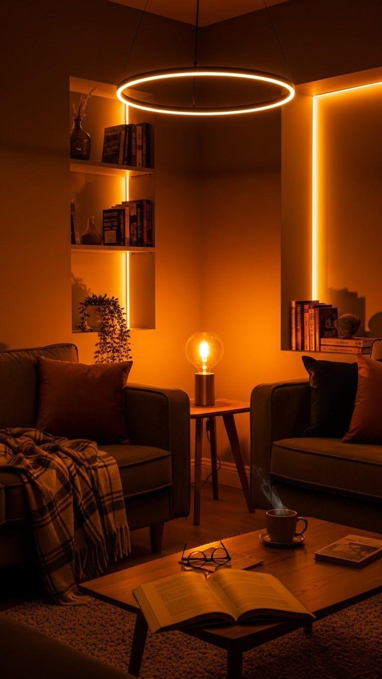 When you want a room to feel intimate and lived-in, warm lighting is the single most persuasive tool you can use. Choose layered light: overhead fixtures on dimmer switches, table lamps with amber bulbs, and soft accent LEDs. You’ll control mood and pace, embracing a relaxed, independent vibe. Let light sculpt corners, invite lingering, and make your space feel like a deliberate, cozy refuge.