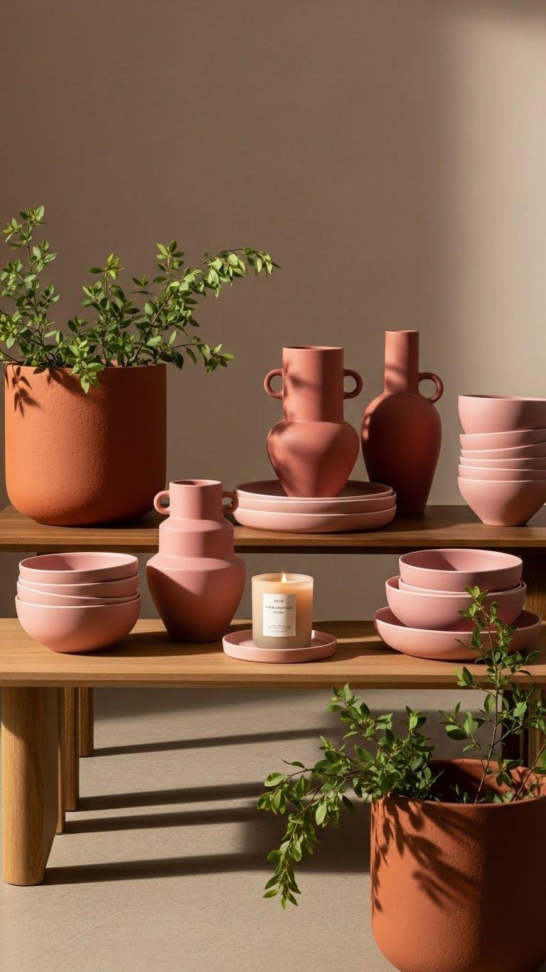 Pull in deep blush and muted terracotta to add a quietly confident pop that complements your earthy base without stealing the show. Layer blush ceramics as subtle focal points—vases, bowls, candles—that invite touch. Pair with terracotta planters for organic texture and life. You’ll craft a liberated, calm atmosphere that feels intentional, modern, and effortlessly personal.