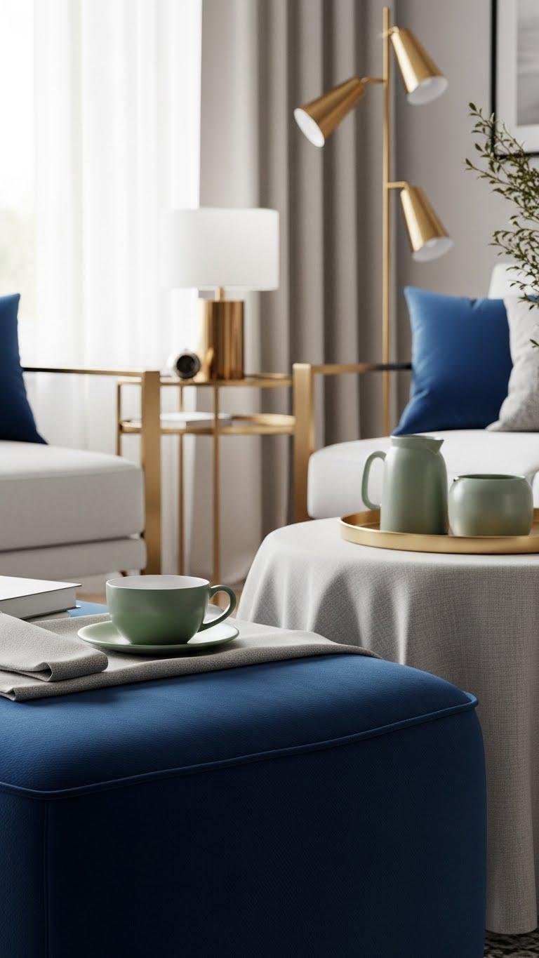 Blend sage green and sapphire blue to create a layered, modern contrast that feels both grounded and unexpectedly luxe. You’ll anchor a sage teacup corner with soft linens and matte ceramics, then punctuate the room using a sapphire velvet ottoman for bold, tactile drama. Choose clean lines, warm brass accents, and open layouts so your space breathes — liberated, stylish, and quietly confident.