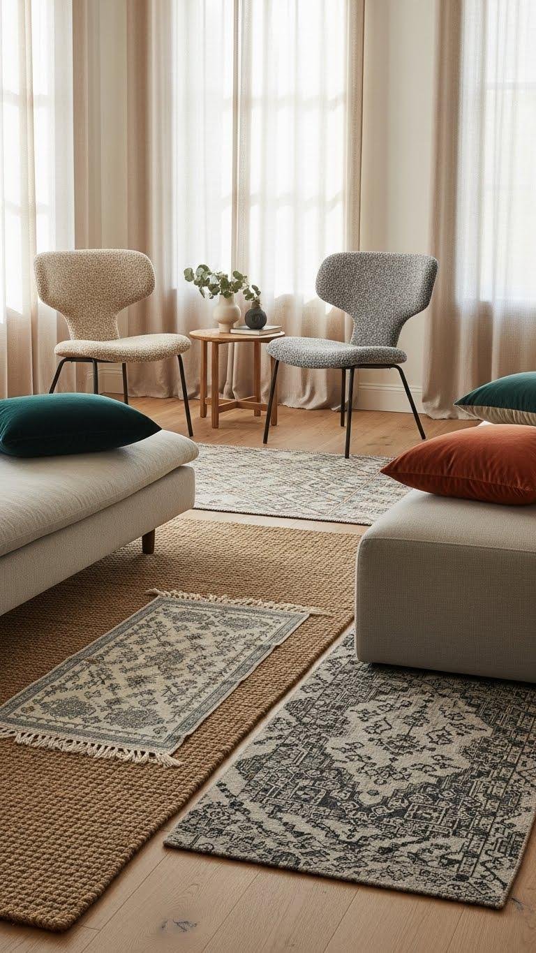 After you’ve established sculptural chairs as visual anchors, layer rugs and upholstery to add tactile depth and warmth without crowding the scheme. You’ll pair a neutral sisal with patterned runners for visual rhythm, then introduce velvet cushions for luxe comfort. Keep palettes restrained, textures varied, and scale balanced so the room feels liberated, cozy, and subtly refined.