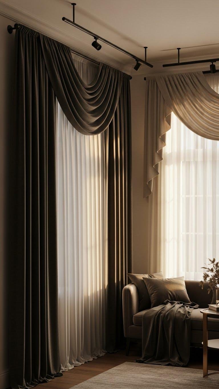 When you want to ground a sunlit room and soften its edges, drape heavy curtains or silk panels to add both visual weight and tactile luxury. You’ll choose velvet swags or flowing silk, pair them with discreet thermal liners for insulation and privacy, and hang them high to elongate the ceiling. The result feels layered, elegant, and freely expressive without fuss.