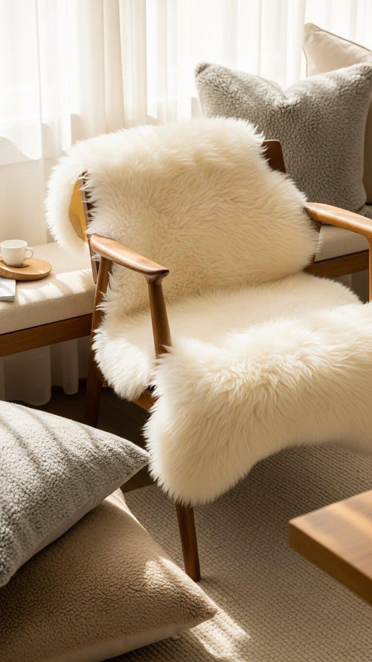 Often, you’ll toss a sheepskin throw over a chair or bench to instantly lift a room’s comfort and style—its plush pile adds tactile warmth while reflecting light for a subtle, upscale glow. Pair sheepskin stools with faux shearling pillows for layered texture; you’ll create a liberated, lived-in look that reads luxe without fuss, welcoming guests while keeping the space breezy and refined.
