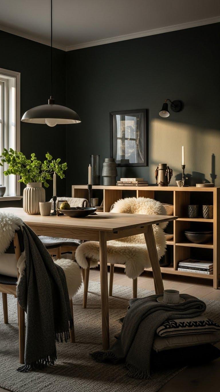 To balance the plush softness of sheepskins, try anchoring your dining room with bold or moody wall color paired with light wood accents — the contrast feels modern and purposeful.
