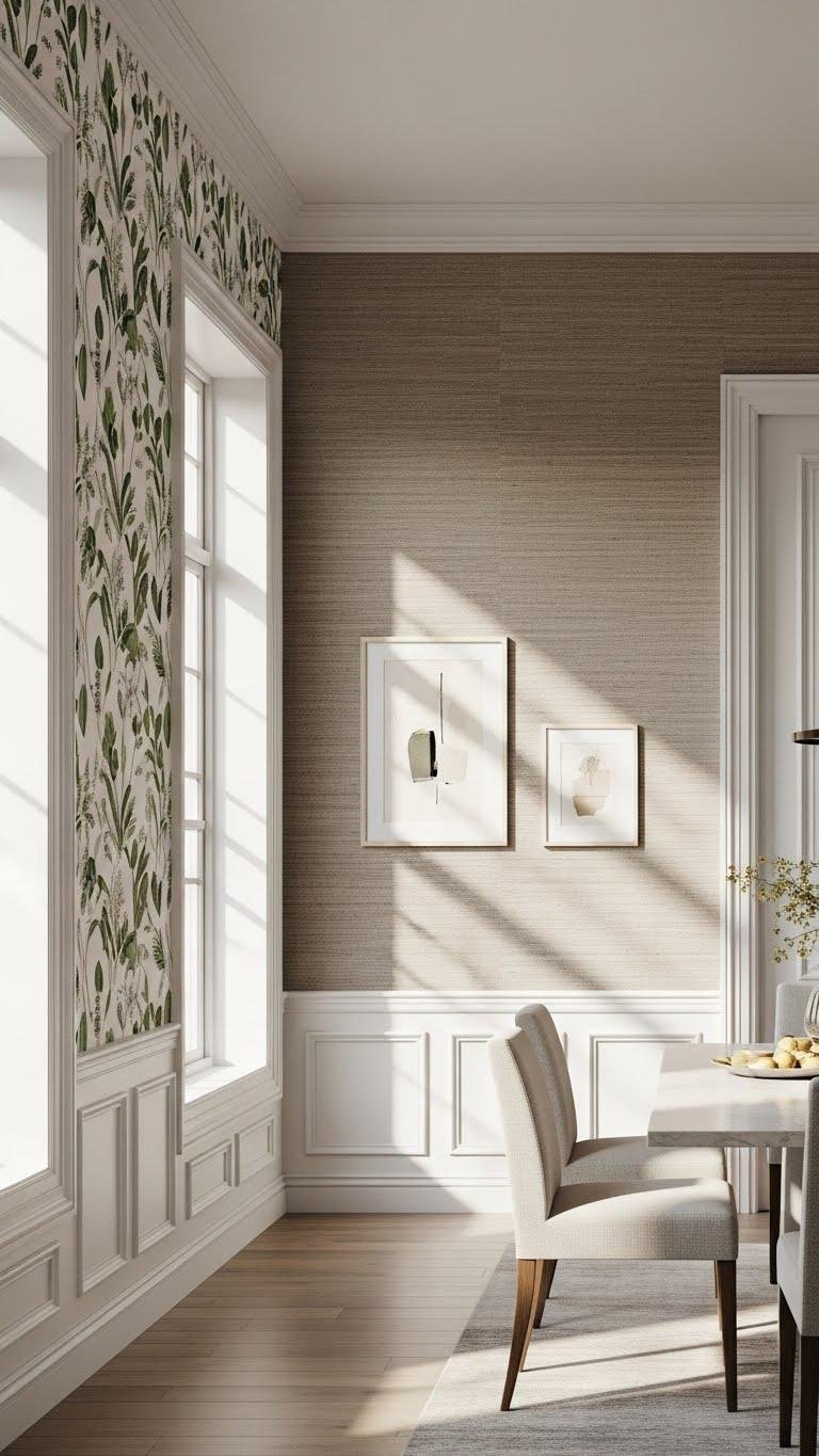 Alongside crisp millwork, botanical or woven wallpaper instantly elevates a dining room with pattern and texture—you’ll get depth without clutter. Pair botanical millwork with woven paneling to frame artful prints or subtle grasscloth, keeping moldings clean and color restrained. You’ll create a liberated, refined space that feels lived-in yet curated—rich tactile contrast that reads elegant, approachable, and modern.