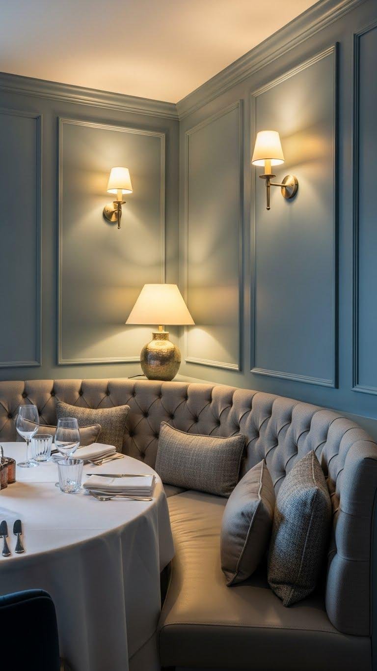 Pairing cushioned banquettes with your blue‑green wainscoted walls creates an intimate, polished nook that feels both modern and lived‑in. Choose tufted upholstery for tactile depth and pair it with tailored pillows so you can relax without sacrificing refinement. Curved banquettes maximize corner space, encourage conversation, and free you from rigid layouts — a stylish, liberated approach to comfortable dining.
