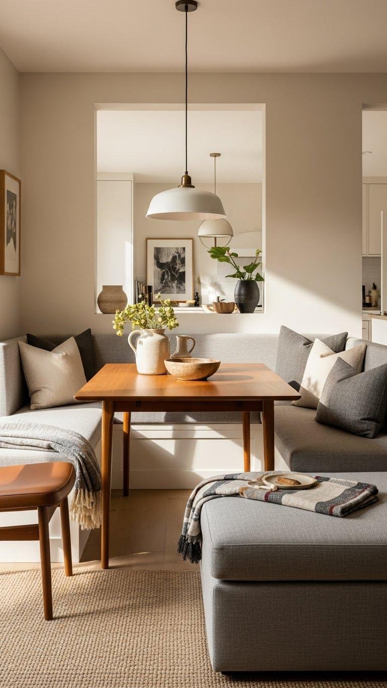 Tuck a low-profile sectional or a snug bench into the dining corner to instantly anchor the space and create a clear dining zone without building walls. You’ll favor banquette zoning for flexible seating, pairing textures and low backs for comfort. Aim for sectional symmetry with the table and lighting, keeping sightlines open so the area feels curated, airy, and free.