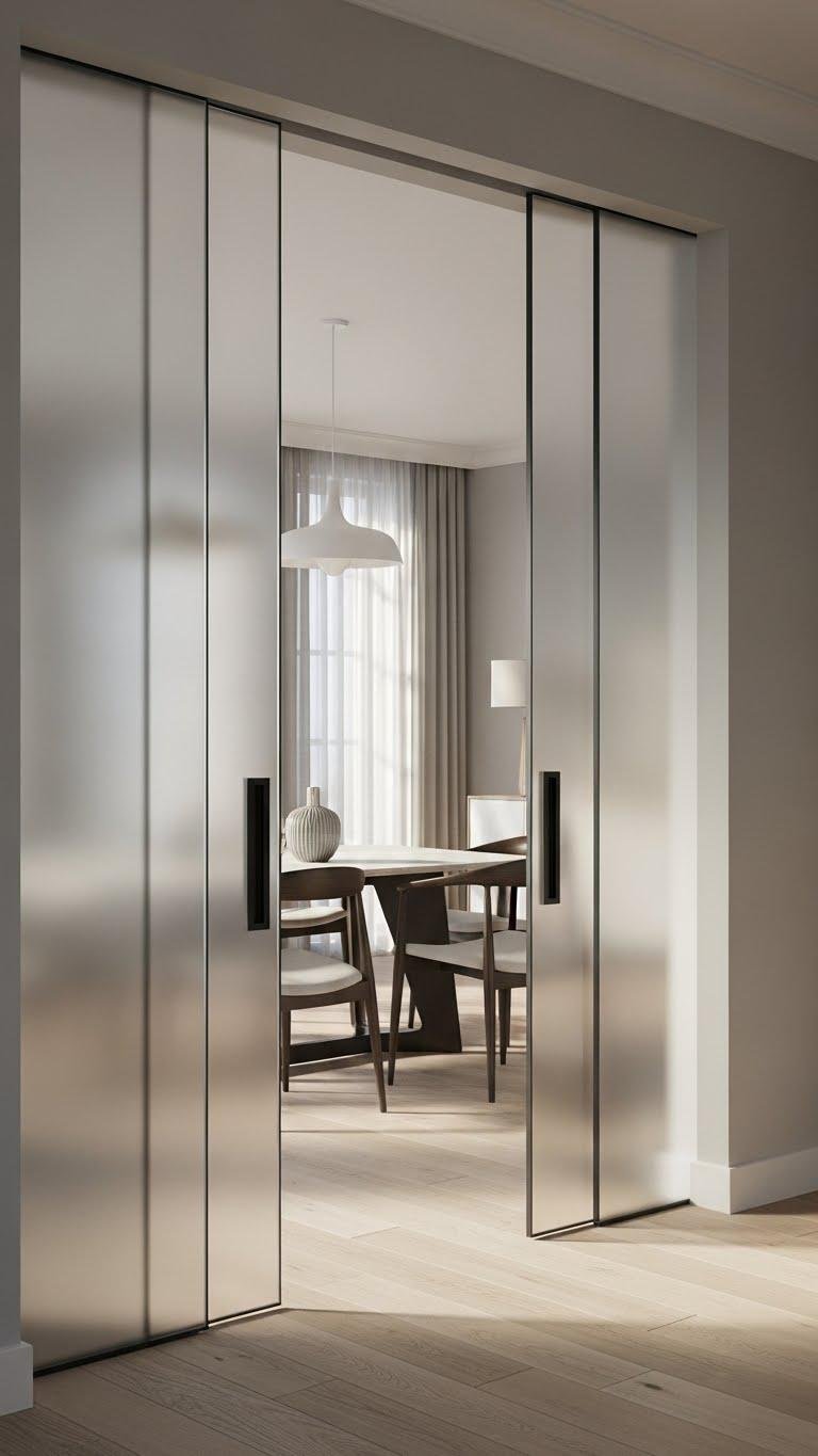Slide glass pocket doors into their cavities to create a smart, flexible separation that keeps rooms connected rather than sealed off. You’ll enjoy transparency with privacy thanks to frosted panels that diffuse light and soften sightlines. Choose minimalist sliding hardware for a sleek, contemporary look that’s easy to operate. This solution preserves flow, defines dining space, and supports an open, liberated home aesthetic.