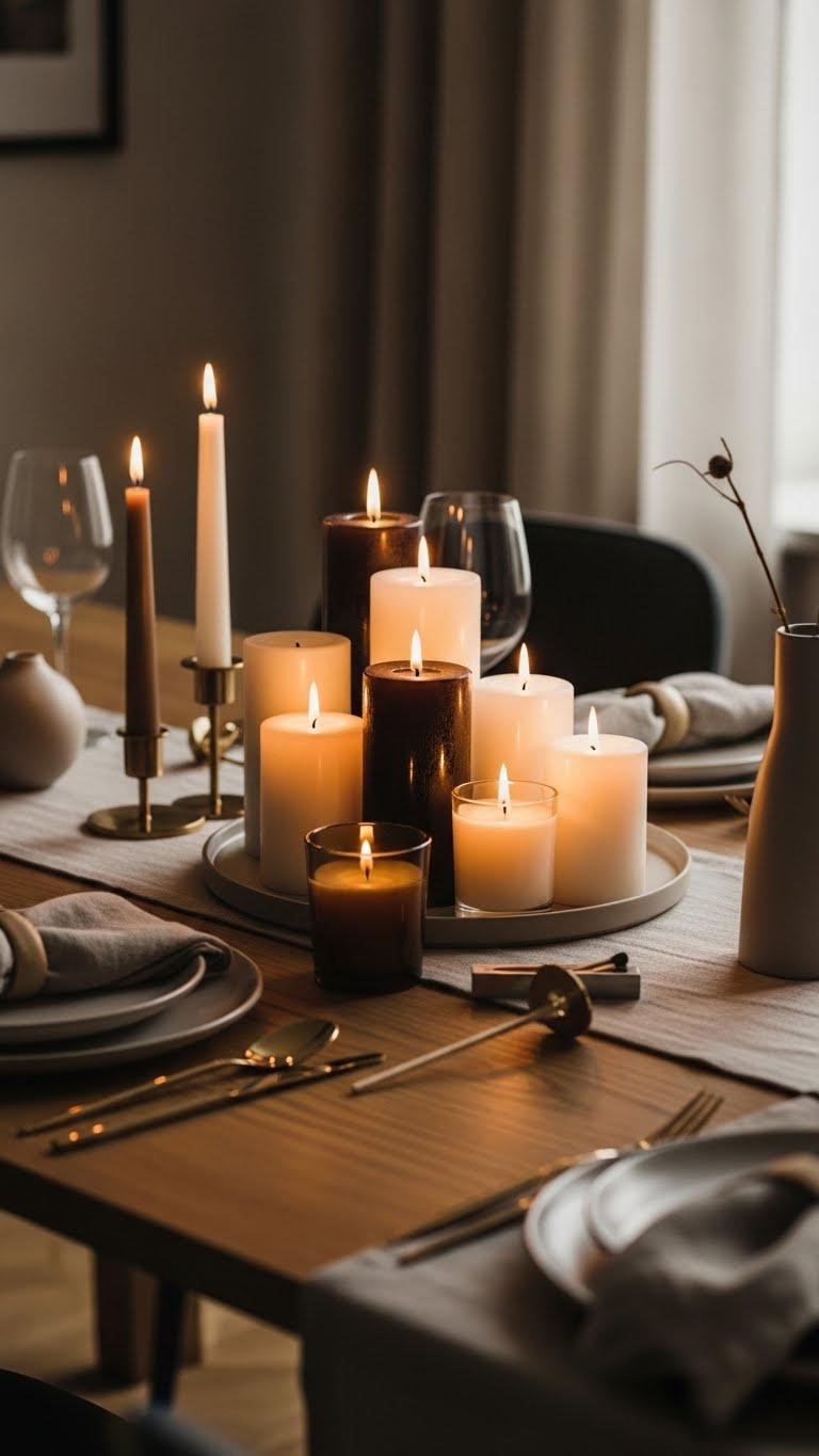 Layer candles and a low tray to give your dining table an intentional, edited look that feels both warm and modern. You’ll choose a mix of heights, scented or unscented, and anchor them on candle trays to protect surfaces. Keep minimalist accents — single stems, a sculptural match striker — so the setting feels liberated, calm, and effortlessly chic for everyday or intimate dinners.