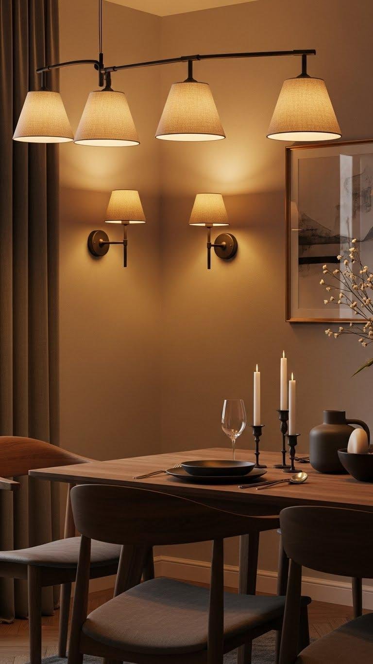 Bring wall sconces in to soften the room and create layers of light that feel deliberate, not accidental. You’ll pick sconces with fabric shades and adjustable arms to control mood and direction, blending practicality with polish. Mount them at eye level to free table space, highlight art, and make the dining area feel both intimate and liberated without overpowering the rest of your decor.