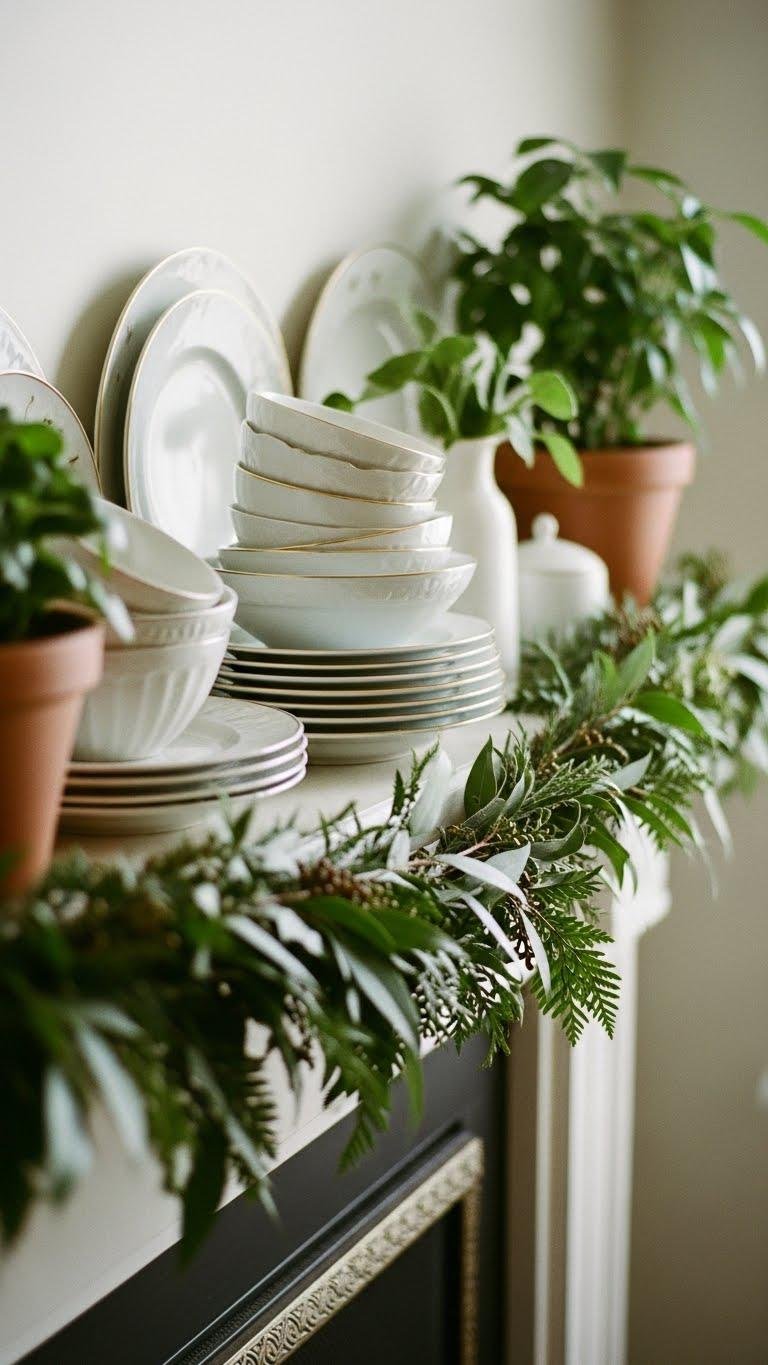 After you’ve perfected a pared-back tablescape with candles and a single stem, carry that same edited sensibility up to the mantel by arranging china, plants, and seasonal greens with purpose.