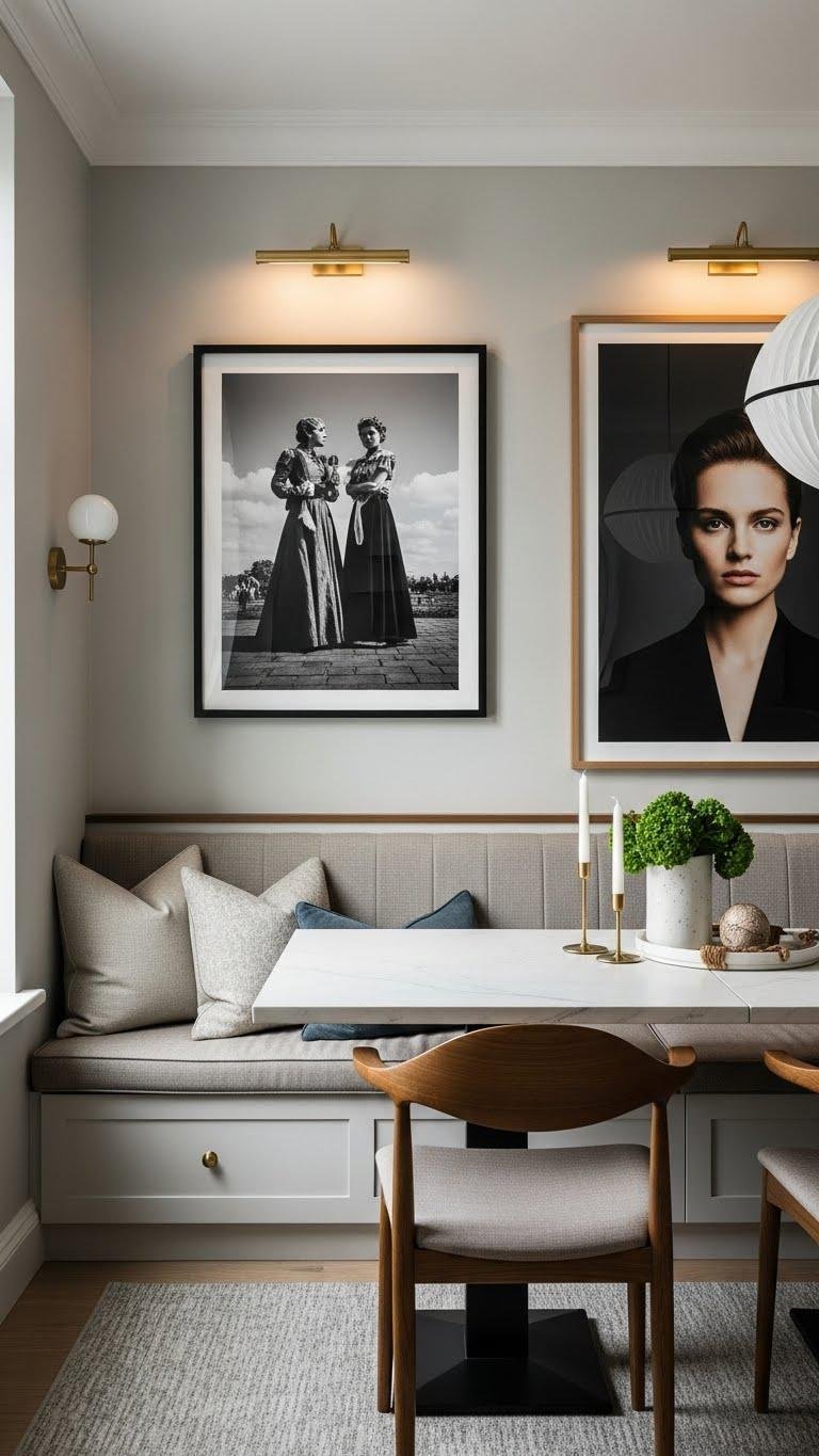 When you anchor a banquette with a single oversized painting or a striking photographic diptych, the seating instantly reads as intentional rather than an afterthought. Choose oversized frames to balance scale, or select monochrome prints for calm, liberated elegance.