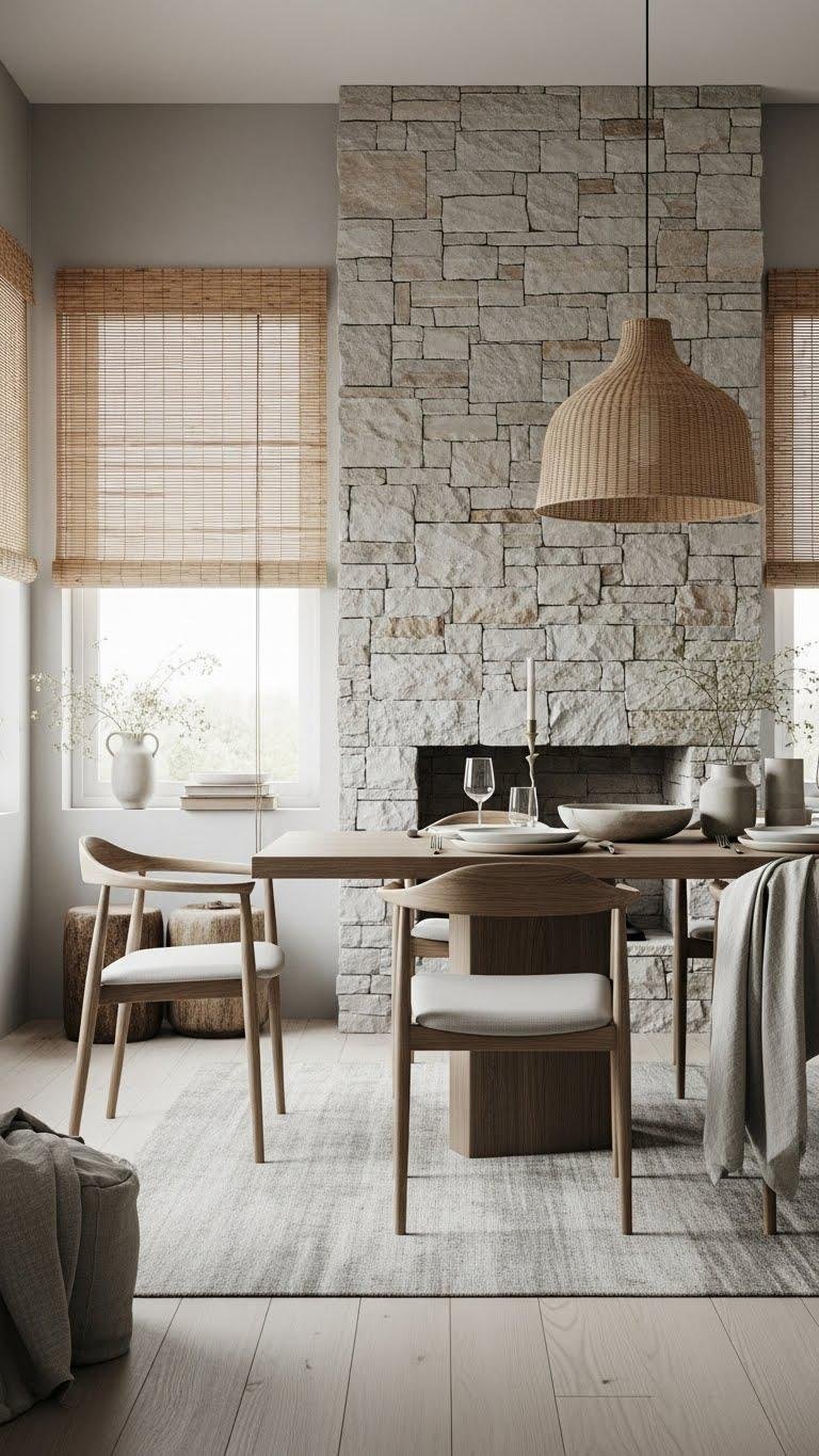 Anchoring your dining room with natural materials like stone walls or bamboo shades immediately grounds the space and brings tactile warmth to a modern scheme.