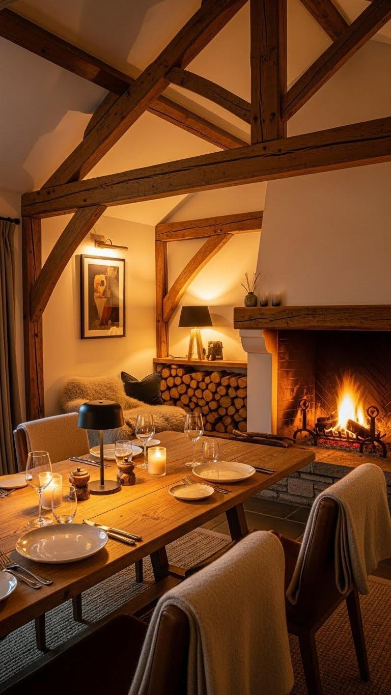 Because exposed beams and a fireplace introduce both structure and warmth, they instantly make a dining room feel intimate and lived-in without sacrificing modern style.