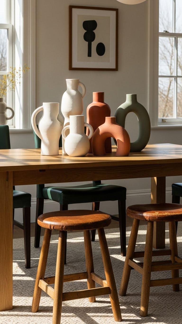 While sculptural accents and vintage stools can seem like small additions, they redefine the room’s personality by layering artful form and storied materiality into your dining scheme. You’ll pick sculptural ceramics as focal points, letting organic silhouettes anchor a table, while vintage stools add tactile history and flexible seating. Together they create a luxe, liberated aesthetic that’s polished yet personal.