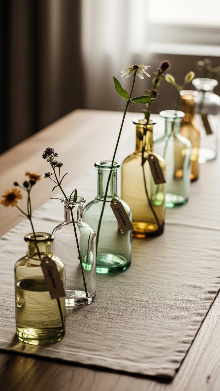 You place vintage glassware along a linen runner, each vase holding a single stem. Mix heights, leave space to breathe, and add tiny botanical labels for a playful, free-spirited touch that feels curated without constraint.