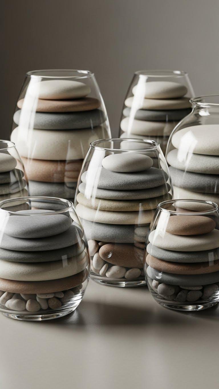 Set out clusters of mixed stones in clear glass vessels to give your table a clean, tactile focal point that plays with light and scale. You’ll layer polished pebbles and small river rocks, using translucent layering to create depth. Vary sizes and tones, leave negative space, and place vessels asymmetrically so the arrangement feels free, calm, and intentionally effortless.