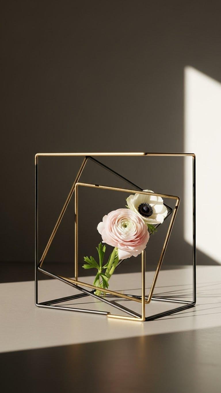 After the soft, organic feel of stones in glass, try anchoring your table with a geometric frame that holds a single, minimal bloom. You’ll love how metallic geometry contrasts a delicate petal, letting negative space breathe. Place it low, centered, and uncluttered so lines and shadow become part of the composition. It’s modern, freeing, and quietly bold without crowding your setting.