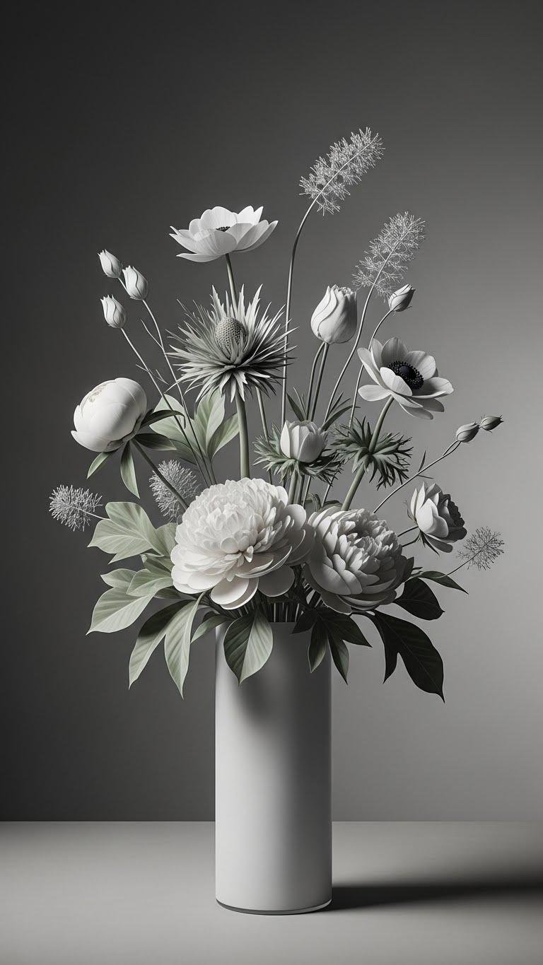 If the single-stem cylinder champions quiet restraint, a monochrome floral composition takes that restraint and sharpens it into a focused mood.