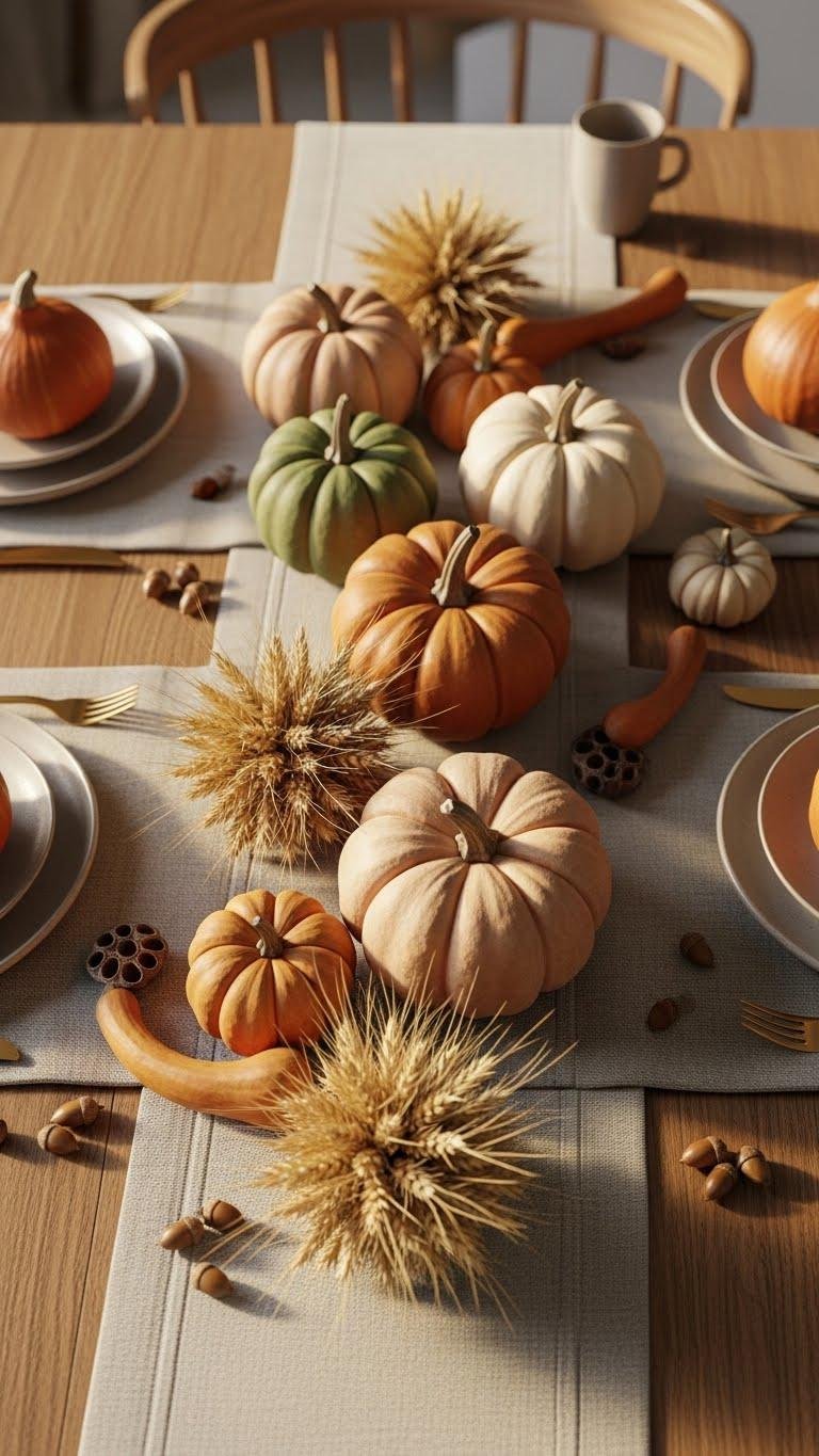 When you set a few small pumpkins down the center of the table and tuck bundles of dried wheat between them, the result feels warm, textural, and intentionally rustic without being fussy. You’ll mix handmade gourds with neutral linens, scatter acorns or seed pods, and leave negative space so each piece breathes. The simple harvest tablescape invites relaxed gatherings and effortless charm.