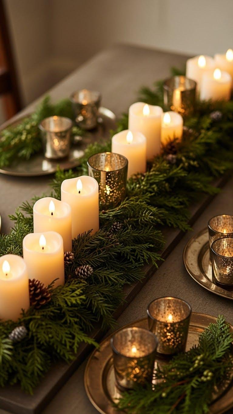 After the warm, textural pumpkin-and-wheat look, bring evergreen, battery candles, and a touch of metallic in to lift the tablescape into winter-ready elegance. You’ll layer evergreen silhouettes—sprigs, small boughs—around clustered battery candles for safe, steady glow. Add subtle metallic accents in trays or votive holders to reflect light. The result feels fresh, unfussy, and quietly celebratory.