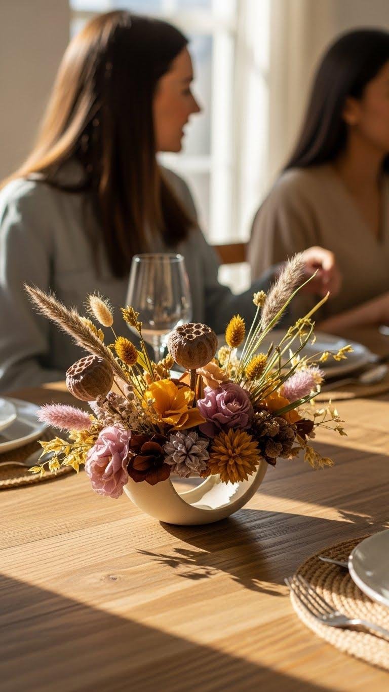 A dried-flower centerpiece gives you lasting texture and effortless charm that survives seasons and spills. You arrange preserved petals, seed pods, and grasses in a low, open vase so diners see one another.