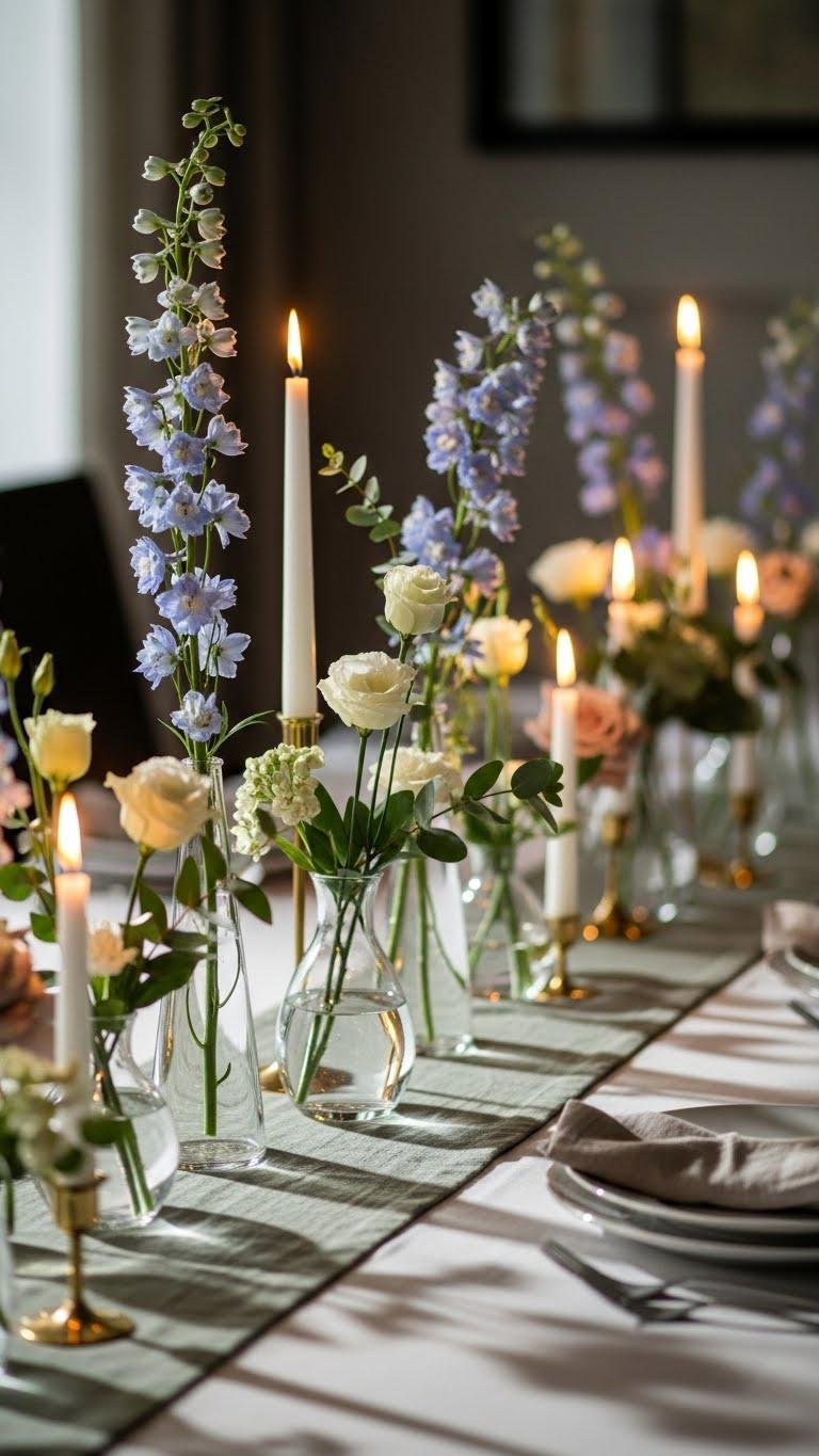Layer varying stem lengths among taper candles to create a rhythm that leads the eye across the table. You’ll balance a tapered vase pairing with tall tapers and low buds, letting a staggered floral silhouette breathe. Choose airy blooms and slim candles for contrast, keep colors spare, and leave negative space so guests feel relaxed, free to move and mingle around a composed, elegant display.