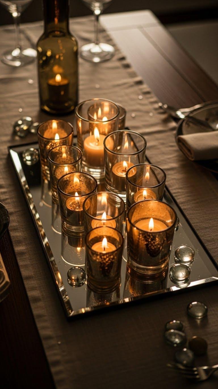 Place a low mirrored tray at the table’s center and cluster votive candles of varying heights on it to multiply warm light and create instant sparkle. You’ll enjoy the sculptural simplicity: a focused votive arrangement creates reflective lighting that expands mood without clutter. Leave space for conversation, scatter a few glass pebbles, and let the glow feel liberating, intimate, and effortlessly elegant.