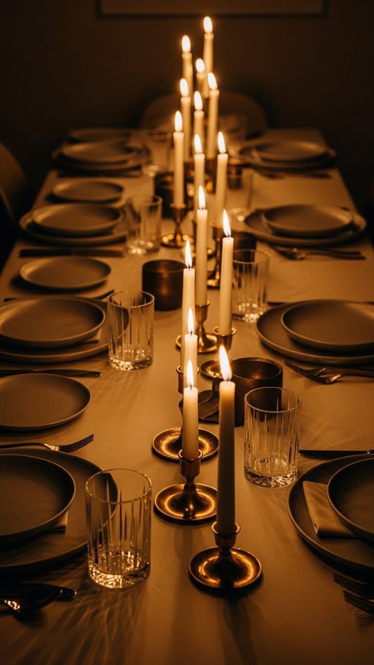 Choose mixed metals or matte finishes, keep heights varied but balanced, and let the low hum of flame encourage easy, free-flowing chatter throughout the meal.
