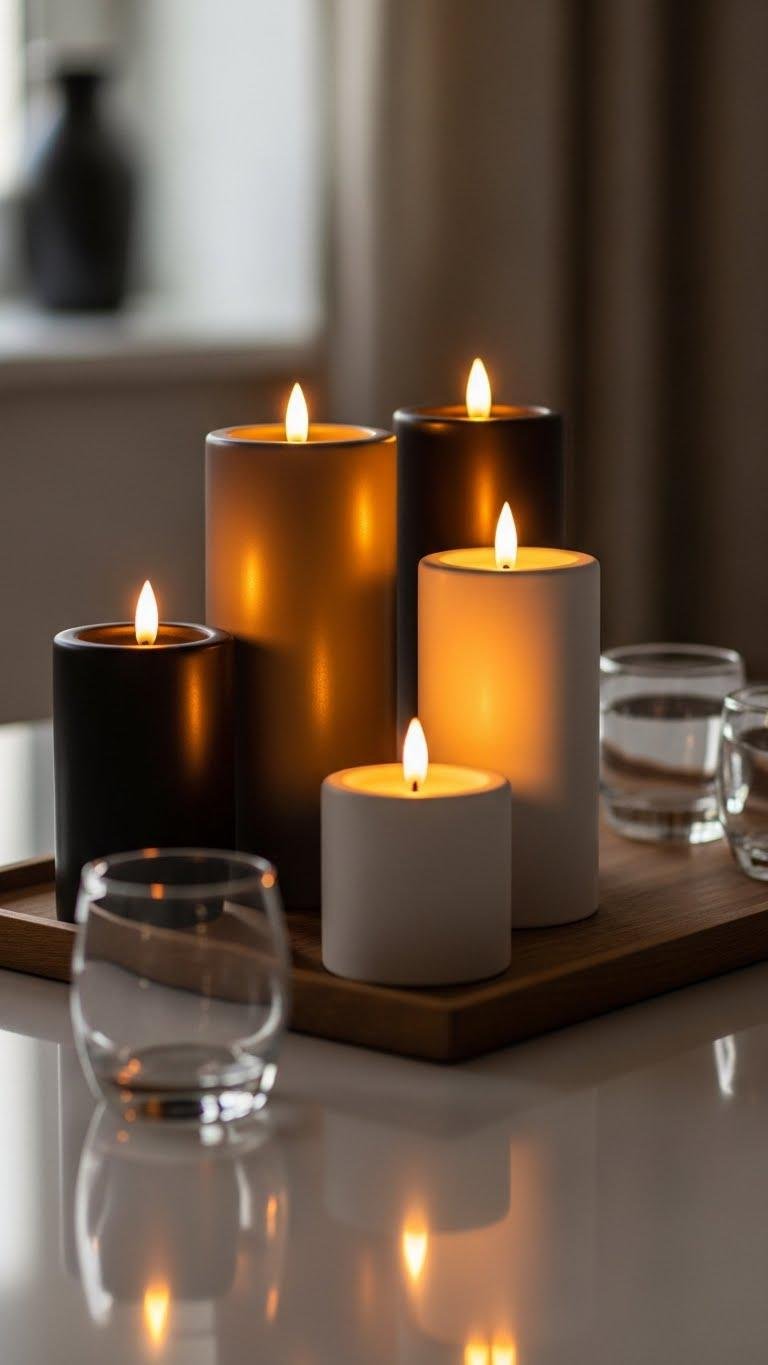 You’ll arrange varied heights and matte holders for clean lines, pairing amber LEDs with glass to amplify flicker realism. It creates portable, safe ambience that frees you to style boldly.