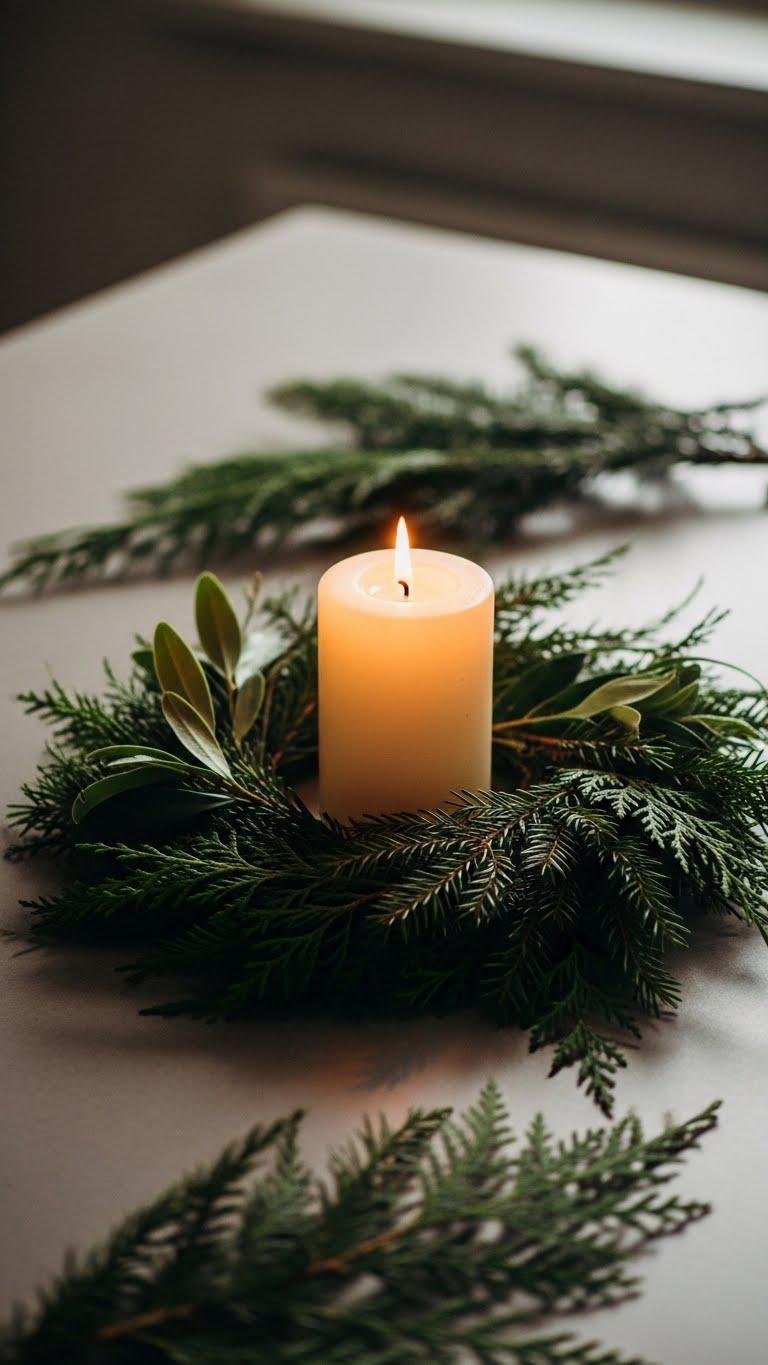Surround a single pillar candle with a low ring of fresh or faux greenery to create an understated, natural centerpiece that’s both elegant and effortless.