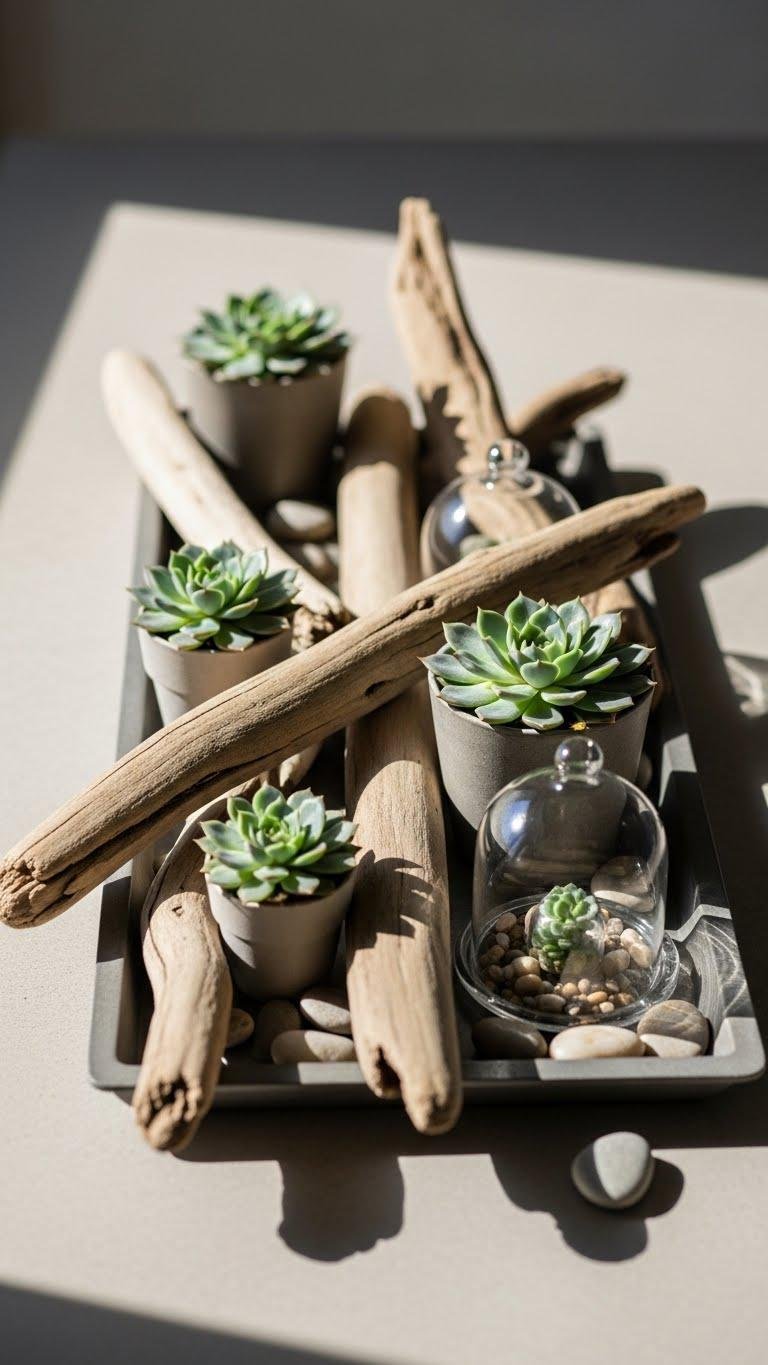 A driftwood-and-succulent tray brings natural texture and low-maintenance greenery to your table, combining weathered wood pieces with small potted succulents for a coastal-meets-modern centerpiece.