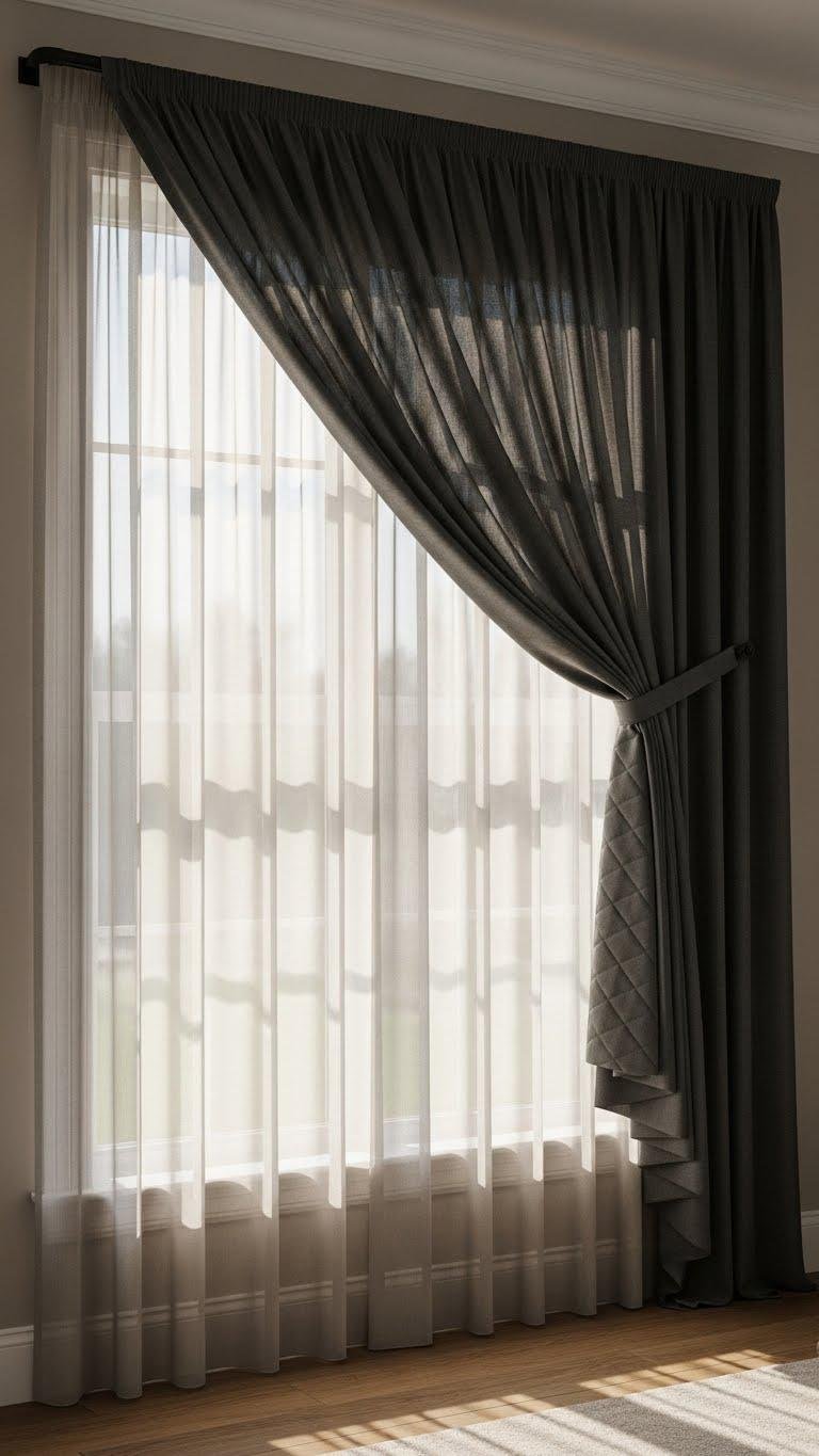 Mix in airy sheers with weightier blackout panels to get precise control over light and privacy while keeping your windows looking intentional. You’ll use sheer blocking for daytime glow, then draw denser drapes for darkness. Layered opacity lets you tailor mood and view; thermal liners boost comfort and efficiency. Choose fabrics that create tactile contrast so curtains feel as freeing as they look.