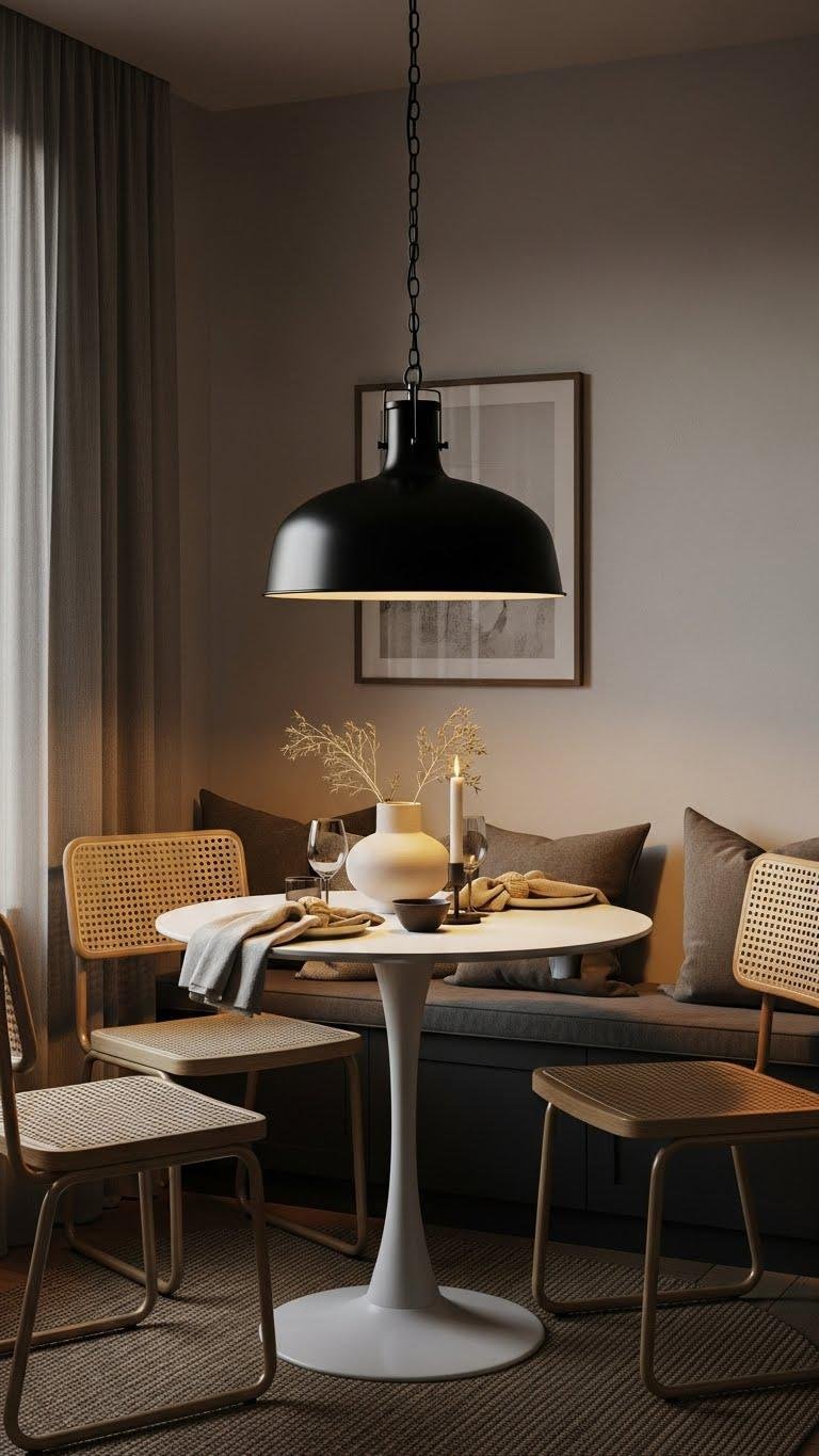 Let texture and finish express your taste — matte black, rattan, or brass — so the tiny dining spot feels liberated and unmistakably you.