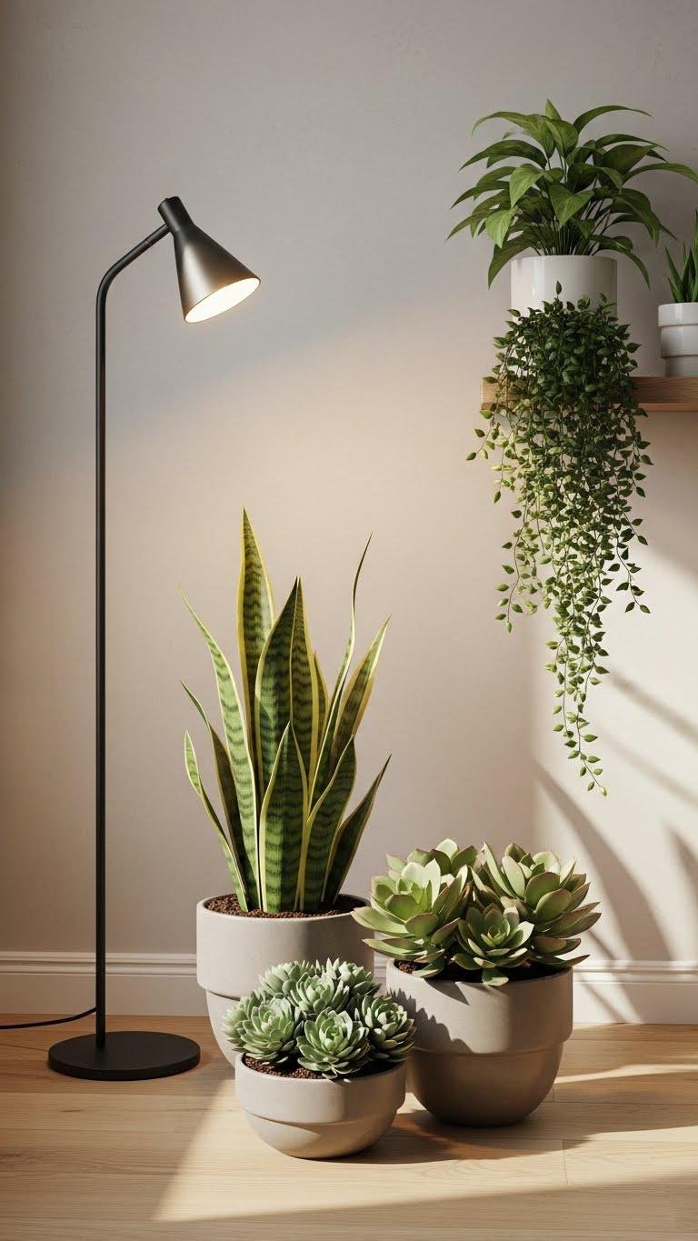 After you’ve freed up sightlines with a slim floor lamp, bring life into that open corner with a low-maintenance plant trio that looks intentional without demanding daily care.
